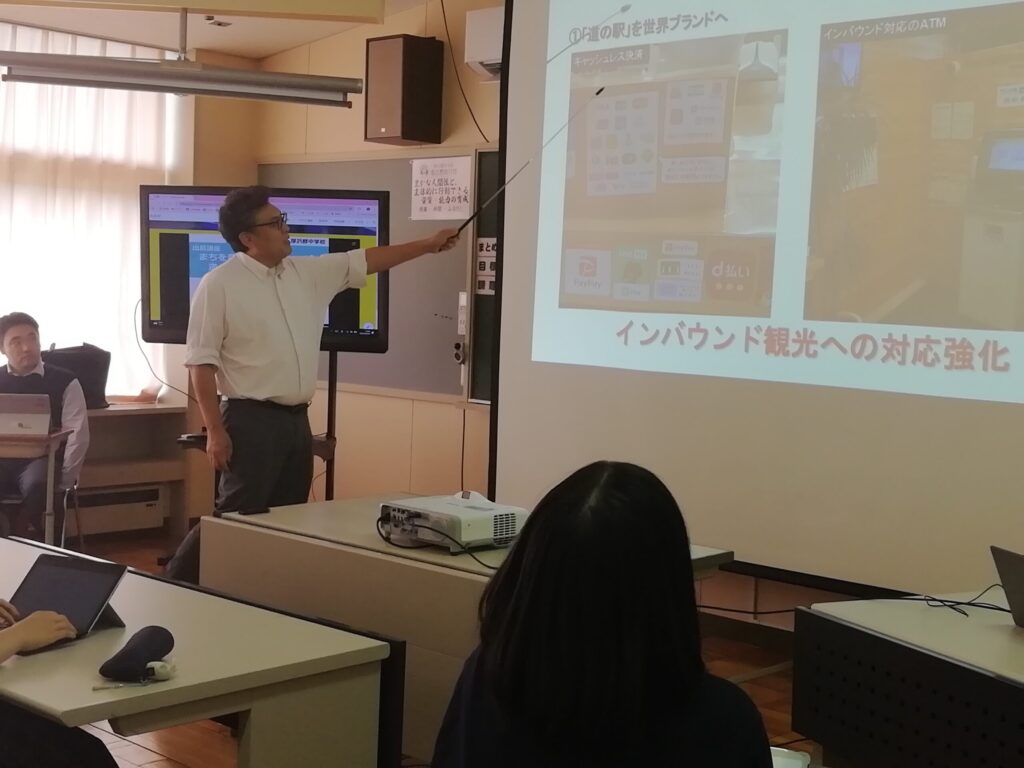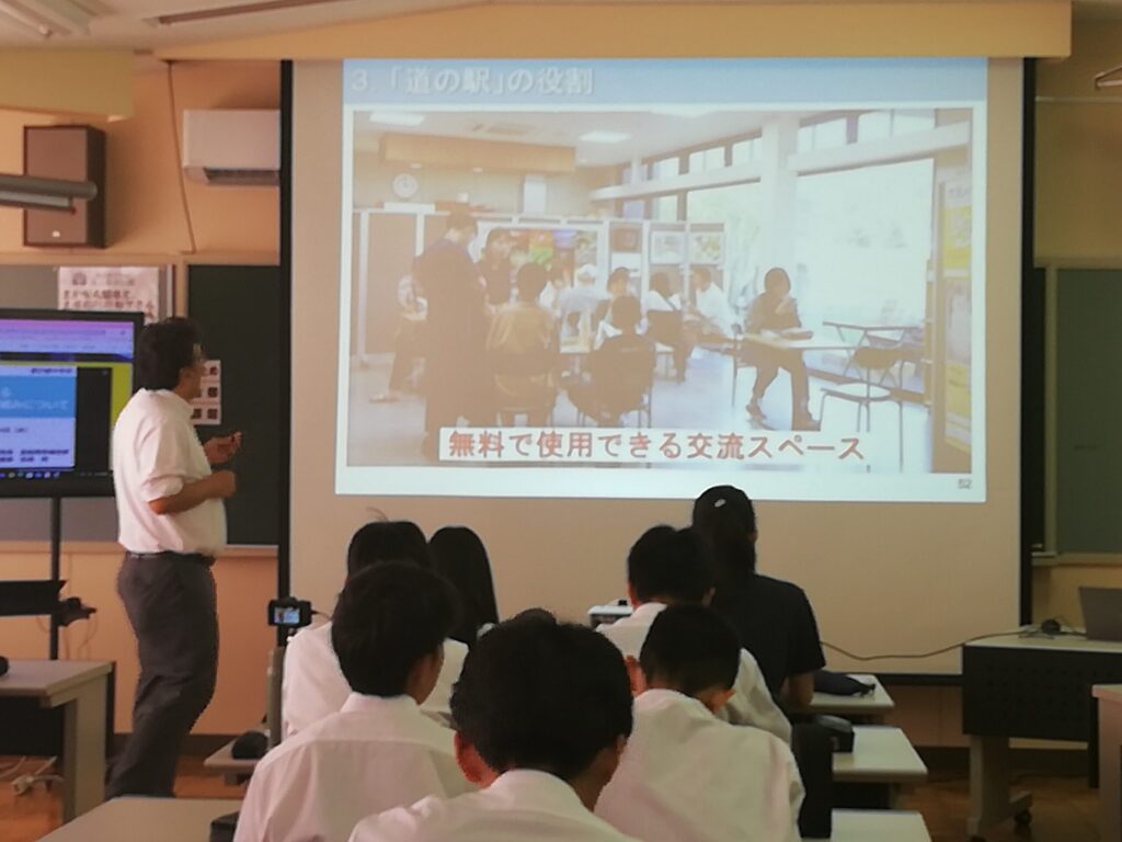 2年生は、まちを豊かにする、道の駅を中止としたビジネスプランを考え、プレゼンを行う計画を立てています。その最初の段階として、今回の出前授業が行われました。