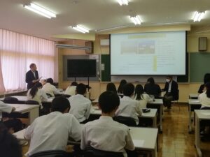 2年生は、まちを豊かにする、道の駅を中止としたビジネスプランを考え、プレゼンを行う計画を立てています。その最初の段階として、今回の出前授業が行われました。