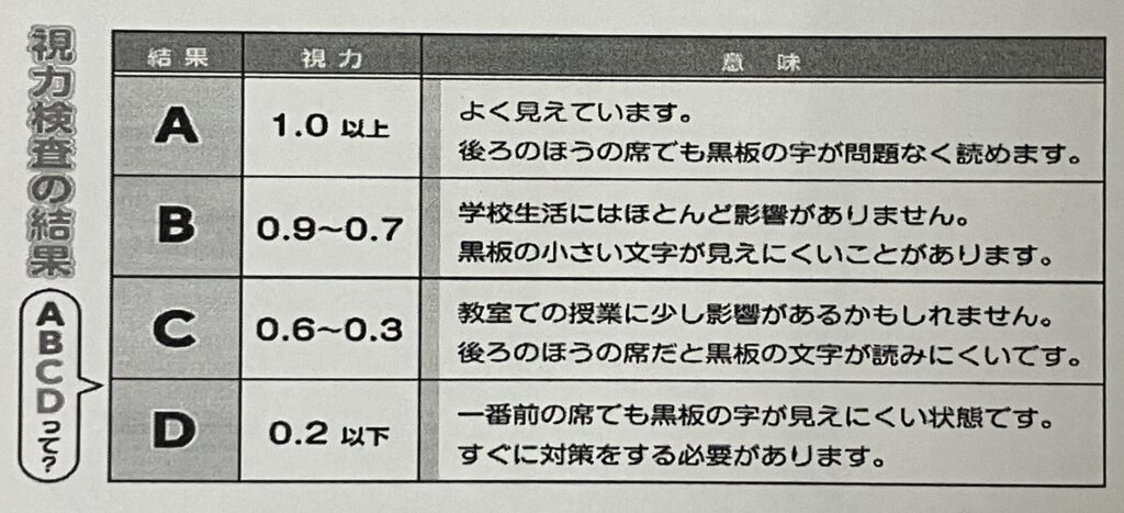 視力検査の結果は、授業や学校生活への影響を踏まえ、下のようにA~Dの4段階に分けられます。