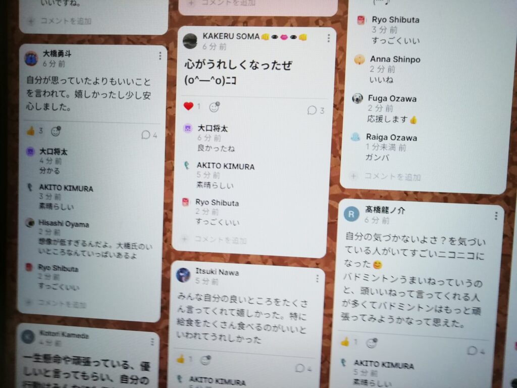 たくさんの褒め褒めシャワーを浴びた生徒たちは、「たくさんいい言葉を言ってもらって嬉しかった」「他の人たちの考えが知れてよかった」など、とても満足気でした。