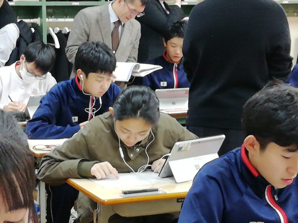 生徒たちは、身近なトピックについて調査し、その結果データをもとに相手にわかりやすく発表する取組をしました。スクールAIを活用し、各自、文章表現の確認や発音の練習などを行い、準備完了。