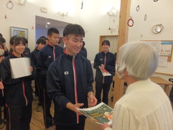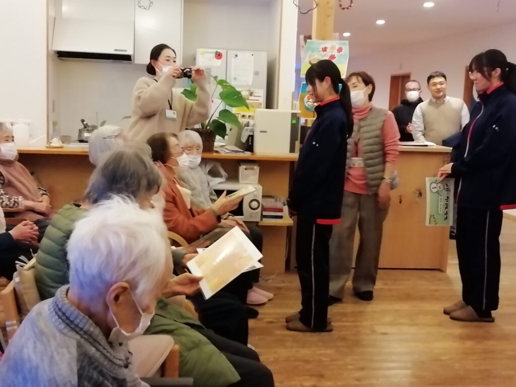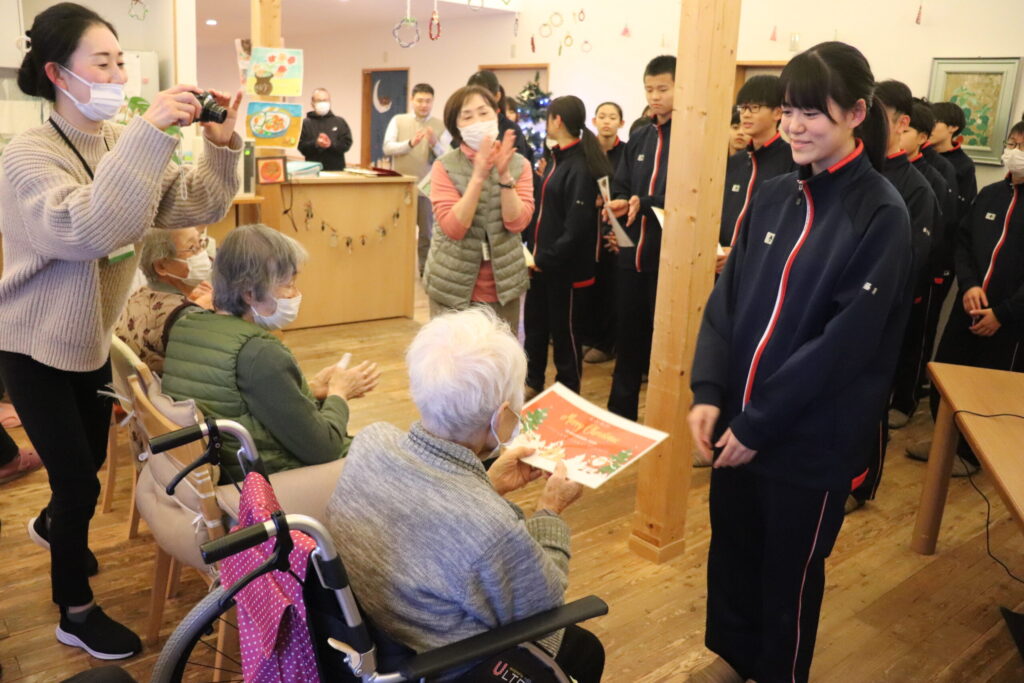 高齢者の方々は、生徒たちからのプレゼントに「上手だね」「ありがとう」と優しい笑顔で声をかけてくださり、とても心温まる時間となりました。