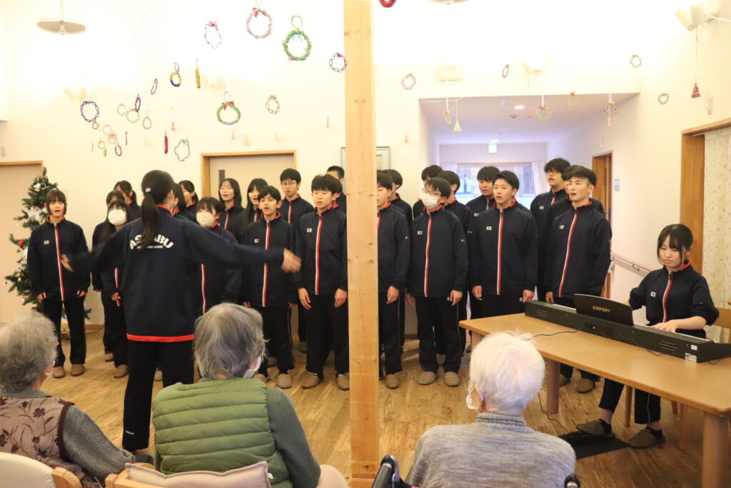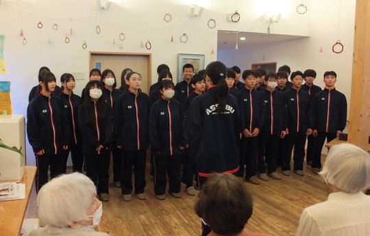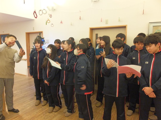 先週の木曜日、2年生は「ゆいま~る」を訪問し、合唱とクリスマスカードをプレゼントしました。