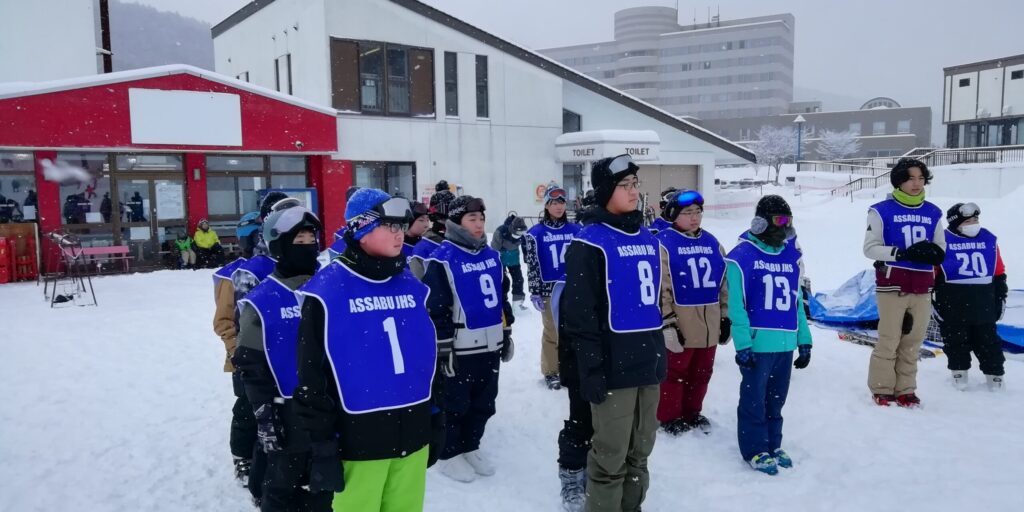 中学校初めてのスキーに緊張気味の1年生、金子先生・校長先生からのお話で気合が入りました!