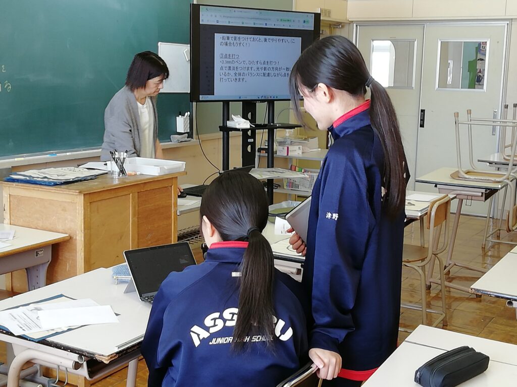 3年生の美術では点描画の制作に入っています。今日は、点描画の題材となる思い出の場所やものを探していました。