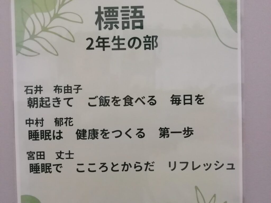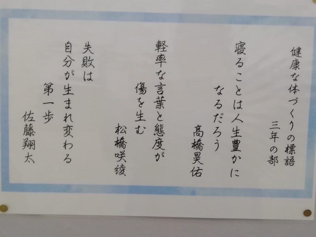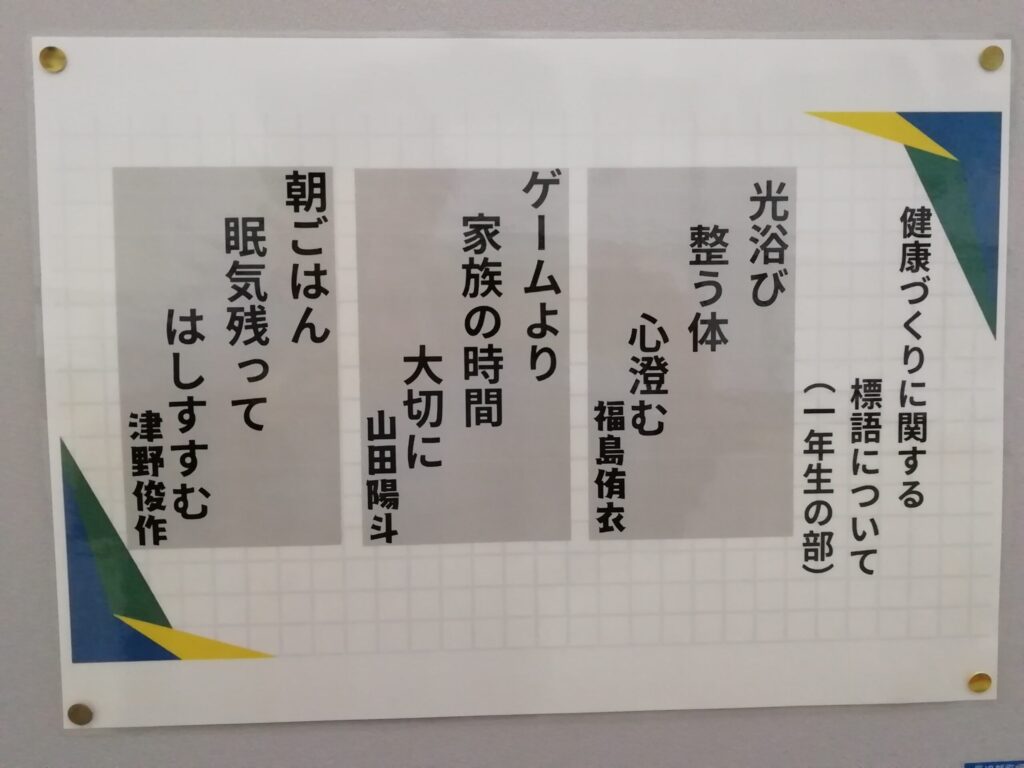 保健専門委員会の取組で、「健康な体づくりに関する標語」が選ばれ、専門委員の手で作成したポスターが保健室前に貼られています。