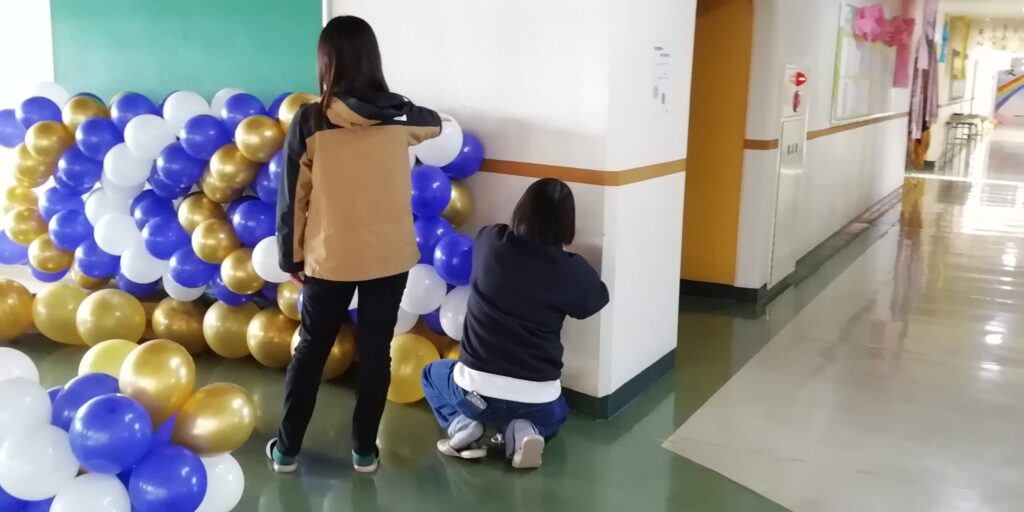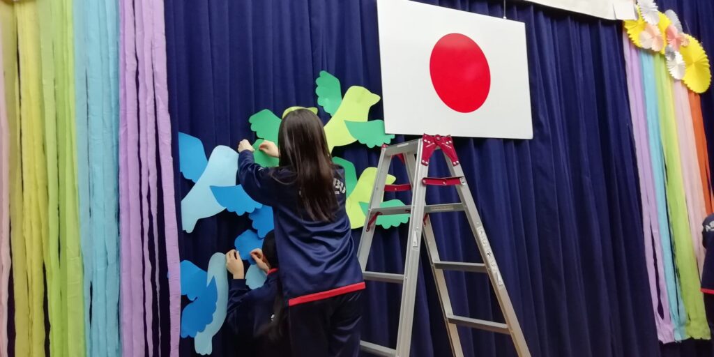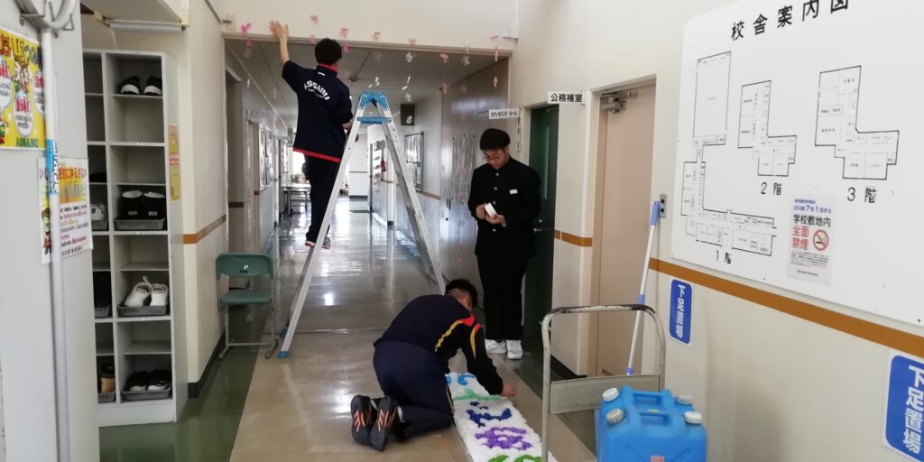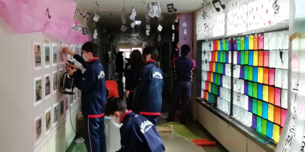 (おまけ)放課後には保護者の方々が装飾に来てくださいました。とても素敵な仕上がりです。お楽しみに。